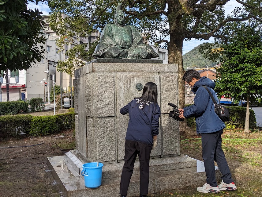 令和6年11月9日(土)三原城跡歴史公園周辺にて行われる「第21回 三原浮き城まつり」その前準備として、今年も隆景像広場小早川隆景像の清掃活動に参加させて頂きました。