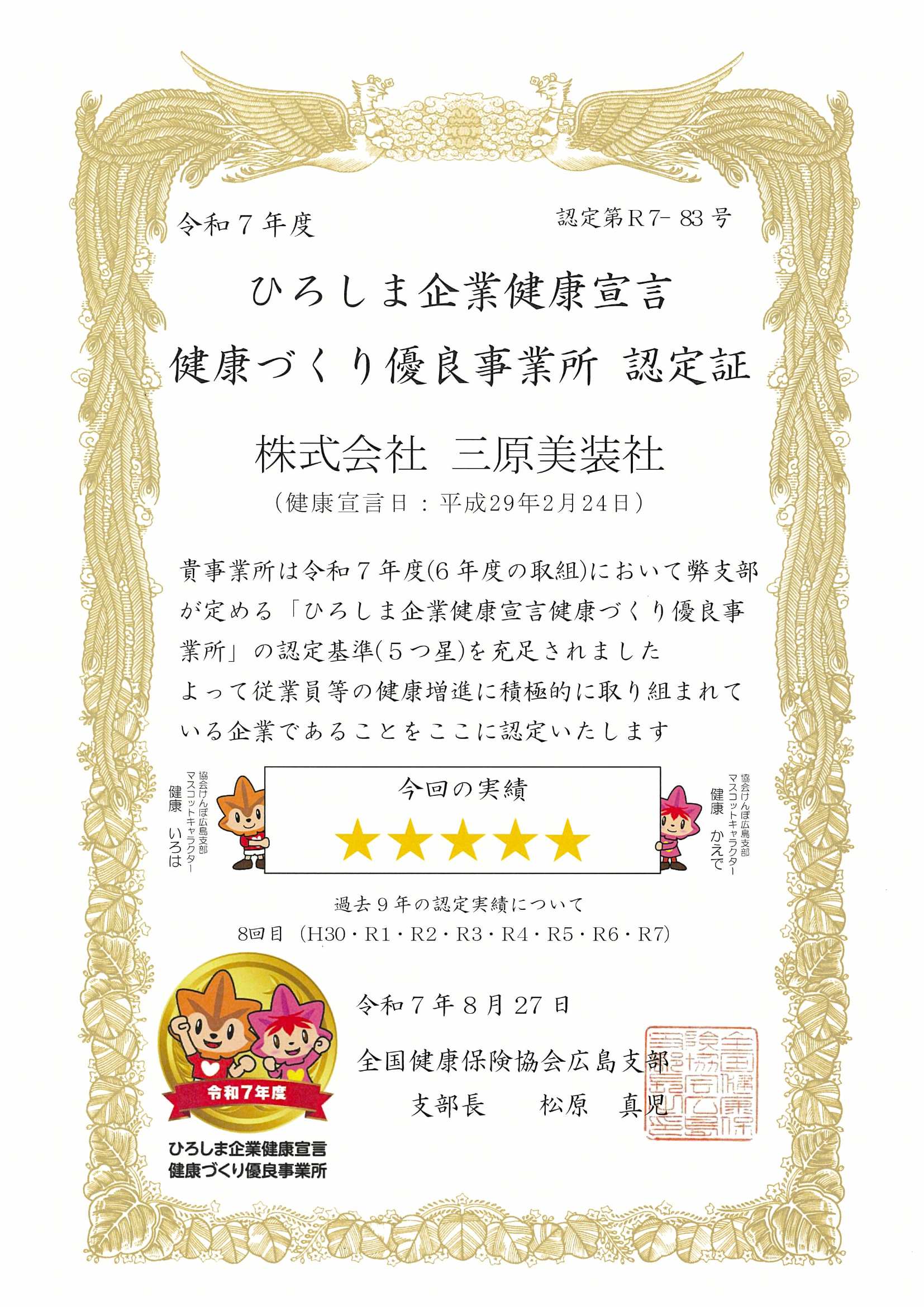 全国健康保険協会広島支部が創設し、企業の健康経営の促進普及を目的とした制度『ひろしま企業健康宣言』 本制度は協会けんぽ広島支部が、従業員の健康増進に向けて参加事業所の健康づくりをサポートする制度で、協会が定めるチェック項目をクリアした企業のみが認定されます。企業の成長は従業員の健康にも比例します、従業員が健康ではつらつと働くことができるということは安定した生産力の確保でもあり企業の成長という点ではとても重要な+の要因と考えます。従業員全ての人が健康に働くことができ、後のセカンドライフも充実したものとなれるようこれからも従業員の健康づくりを推進し環境づくりに努力していきます。